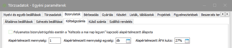 Elérése: Törzsadatok -> Egyéni paraméterek -> Bizonylatok (fül) -> Költségszámla (fül) vagy