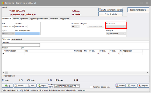 Europroof -> Egyéni paraméterek -> Bizonylatok (fül) -> Szállítói rendelés (fül)