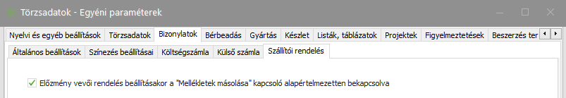 Beállítása esetén: a Vevői rendelés előzménybizonylatból készített Szállítói rendelés bizonylatra rákerülnek a Vevői rendelés bizonylathoz rögzített mellékletek.