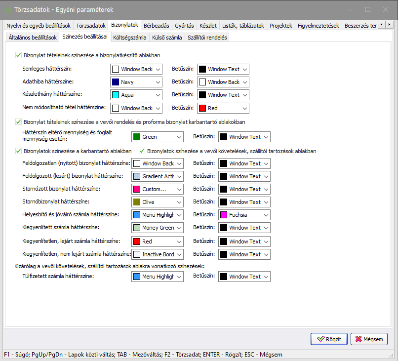 Elérése: Törzsadatok -> Egyéni paraméterek -> Bizonylatok (fül) -> Színezés beállításai (fül) vagy