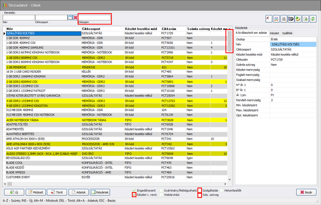 Szolgáltatás jelölő aktív. - Cikkszám szűrő alapértelmezése