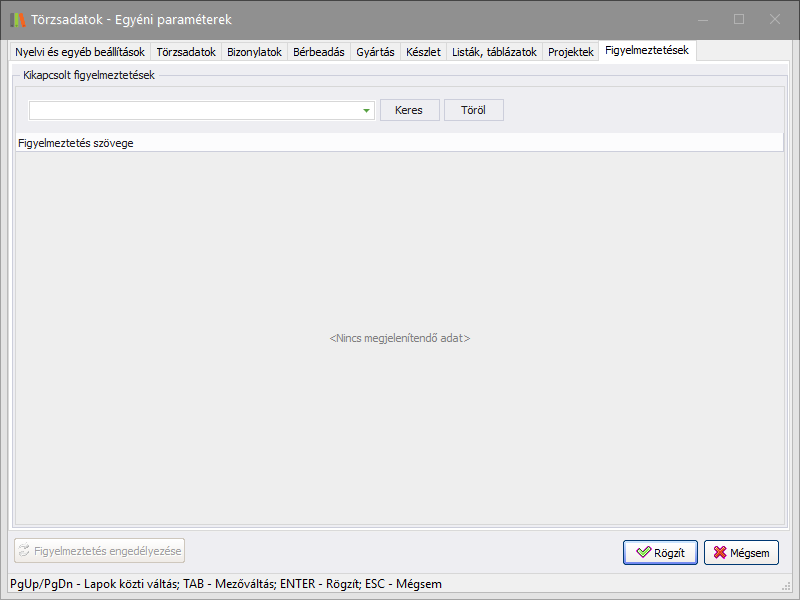 Elérése: Törzsadatok -> Egyéni paraméterek -> Figyelmeztetések (fül)