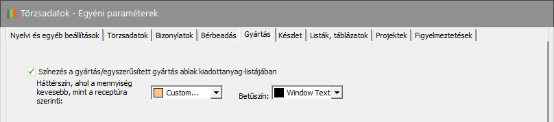 Elérése: Törzsadatok -> Egyéni paraméterek -> Gyártás (fül) vagy