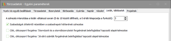 Ezen a fülön állíthatja, hogy a különböző listák és táblázatok sorainak színezése milyen intenzitású legyen, valamint szabályozhatja a szabadnapok hátterének színezését.