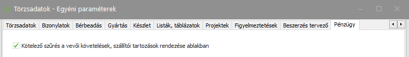a paraméter alapértelmezetten kikapcsolt állapotú, ekkor a Pénzügy- Vevői követelések, szállítói tartozások rendezése ablak a szűrési feltételekben beállított lekérdezésnek megfelelő bizonylatok betöltésével nyílik meg. Amennyiben a paraméter bekapcsolt állapotú, a szűrési feltételeknek megfelelő bizonylatok csak a