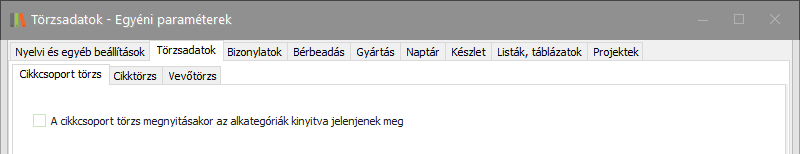 Elérése: Törzsadatok -> Egyéni paraméterek -> Törzsadatok (fül) -> Cikkcsoport törzs (fül) vagy