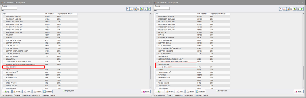 A kapcsolóval beállítható a cikkcsoport törzs alapértelmezett megjelenési formája. A kapcsoló bejelölésével a cikkcsoport törzs megnyitásakor az alkategóriák látszani fognak. Az alábbi képen a Törzsadatok -> Cikkcsoport törzs menüpont megjelenése látható először inaktív egyéni paraméter beálllítással, majd a bekapcsolt egyéni paraméterrel: