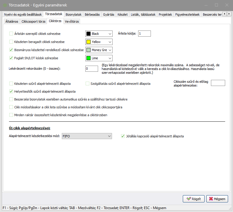 - Árlistán szereplő cikkek színezése: Az Árlista kódjánál megadott árlistán szereplő cikkeket a program az itt beállított színnel jelöli a Cikktörzsben, amennyiben ez az opció be van pipálva.