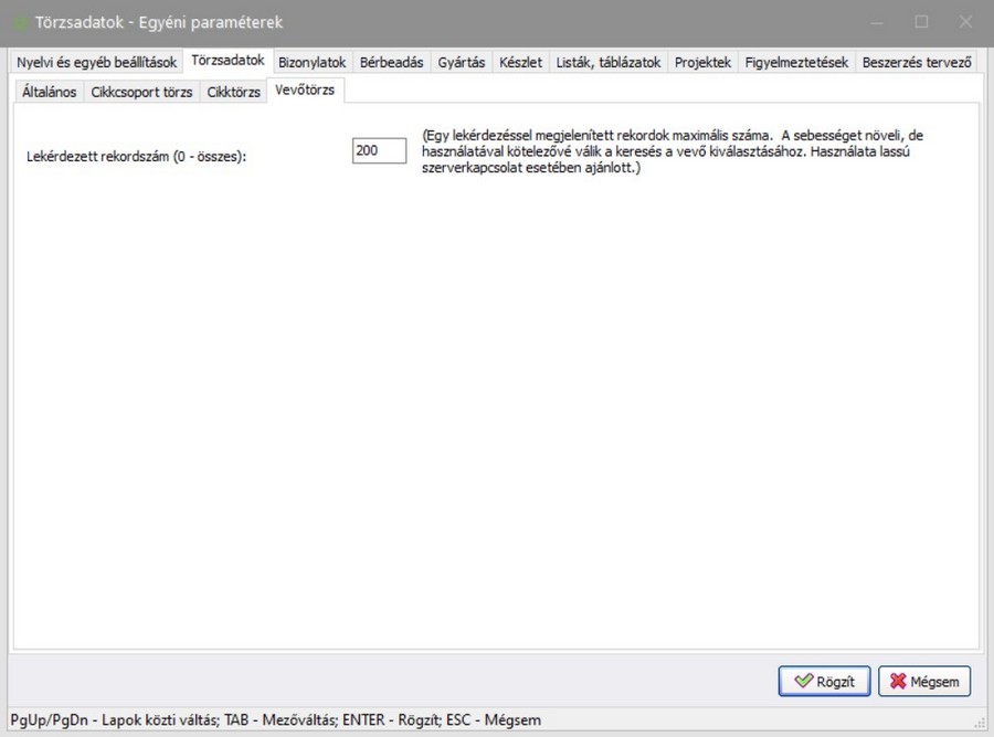 Egy lekérdezéssel megjelenített rekordok maximális száma. A sebességet növeli, de használatával kötelezővé válik a keresés a vevő kiválasztásához. Használata ajánlott lassú szerverkapcsolat esetén. 0 beírása esetén az összes rekordot lekérdezi egyszerre.