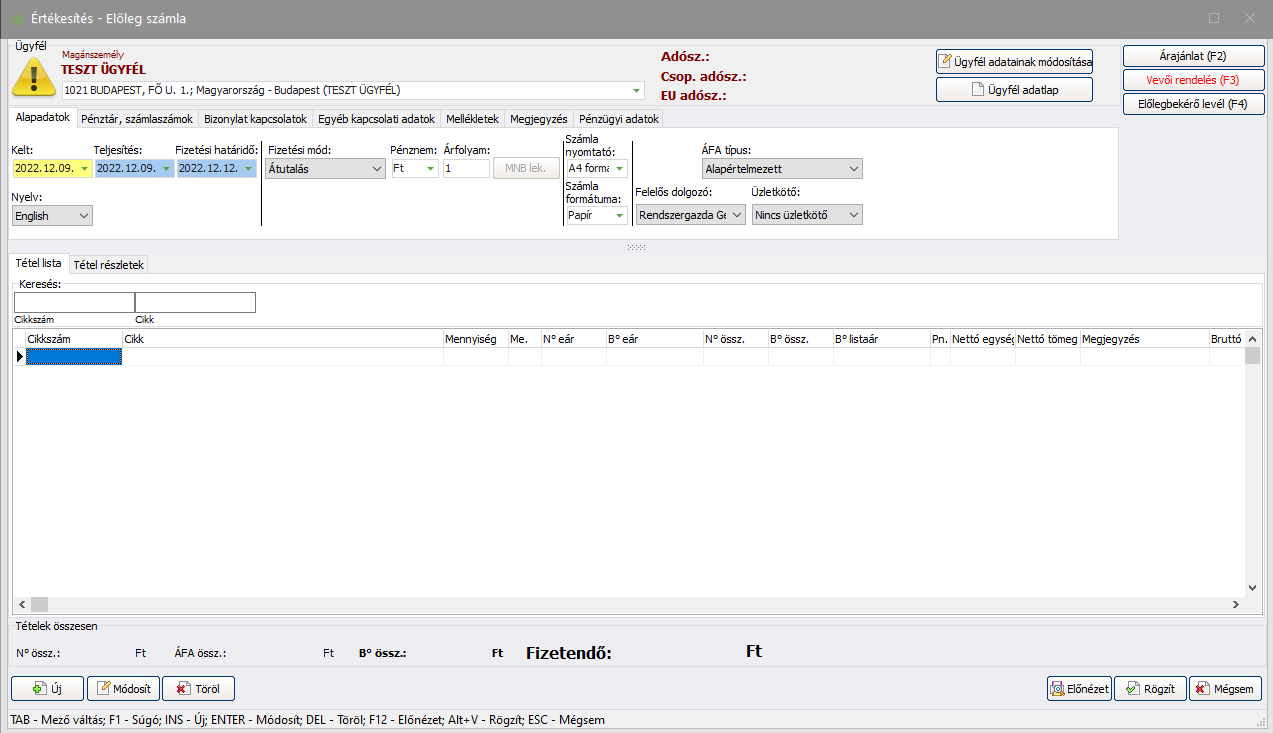 (Következő) gomb segítségével, vagy az F10 gyorsbillentyű használatával van lehetőség. - Ha szeretné megtekinteni az előleg számla nyomtatási képét rögzítés előtt, kattintson az