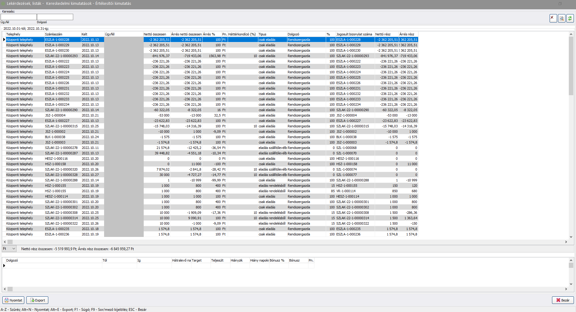 A megadott dátum intervallum között keltezett bizonylatok esetén vizsgálja az adott értékesítő munkáját. Alapértelmezett értéke az előző hónap első és utolsó napja.