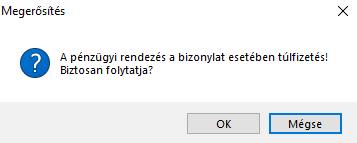 Ha rendezés értéke nagyobb mint a fennmaradó Tartozás/Követelés, akkor a rendszer egy megerősítő ablakkal tájékoztatja a felhasználót, hogy ezzel a rendezéssel túlfizetést készít: