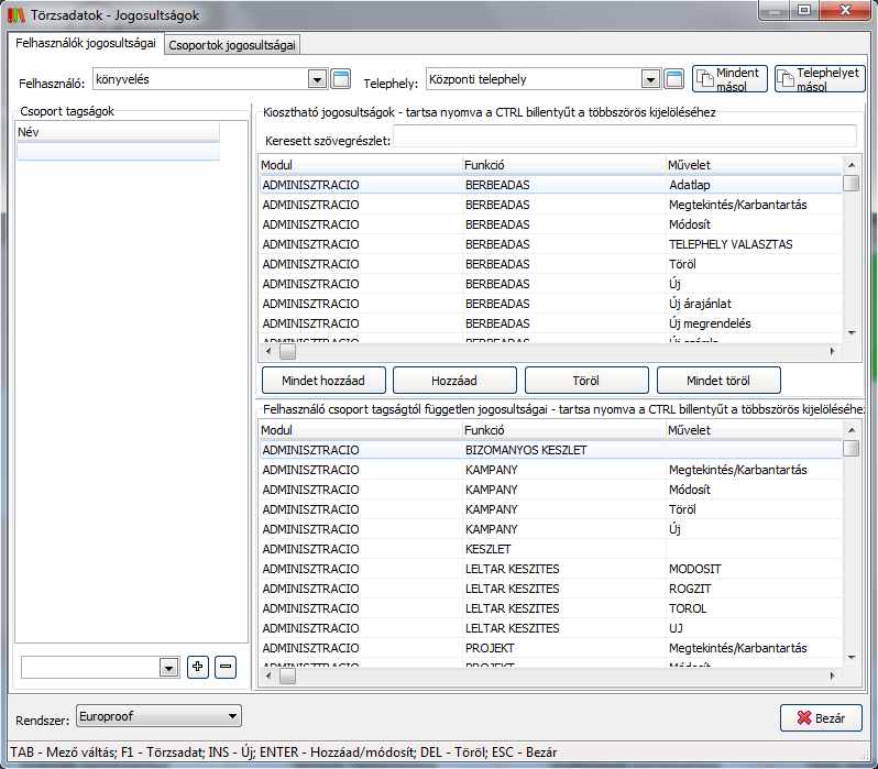 Elérése: Europroof -> Jogosultságok vagy Törzsadatok -> Jogosultságok
