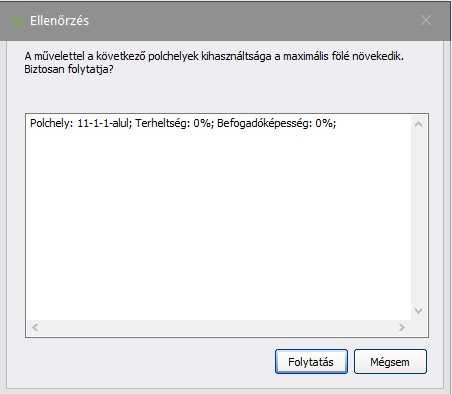 (Zárás) gombra kattintva megtörténik a tárolás véglegesítése, és a készülő tárolási bizonylaton megjelenik a "Lezárva" résznél a lezárás dátuma. Amennyiben a polchely kihasználtsága a betárolás során a maximális fölé növekszik, a rendszer arről tájékoztatást küld, azonban a betárolás folyamata a