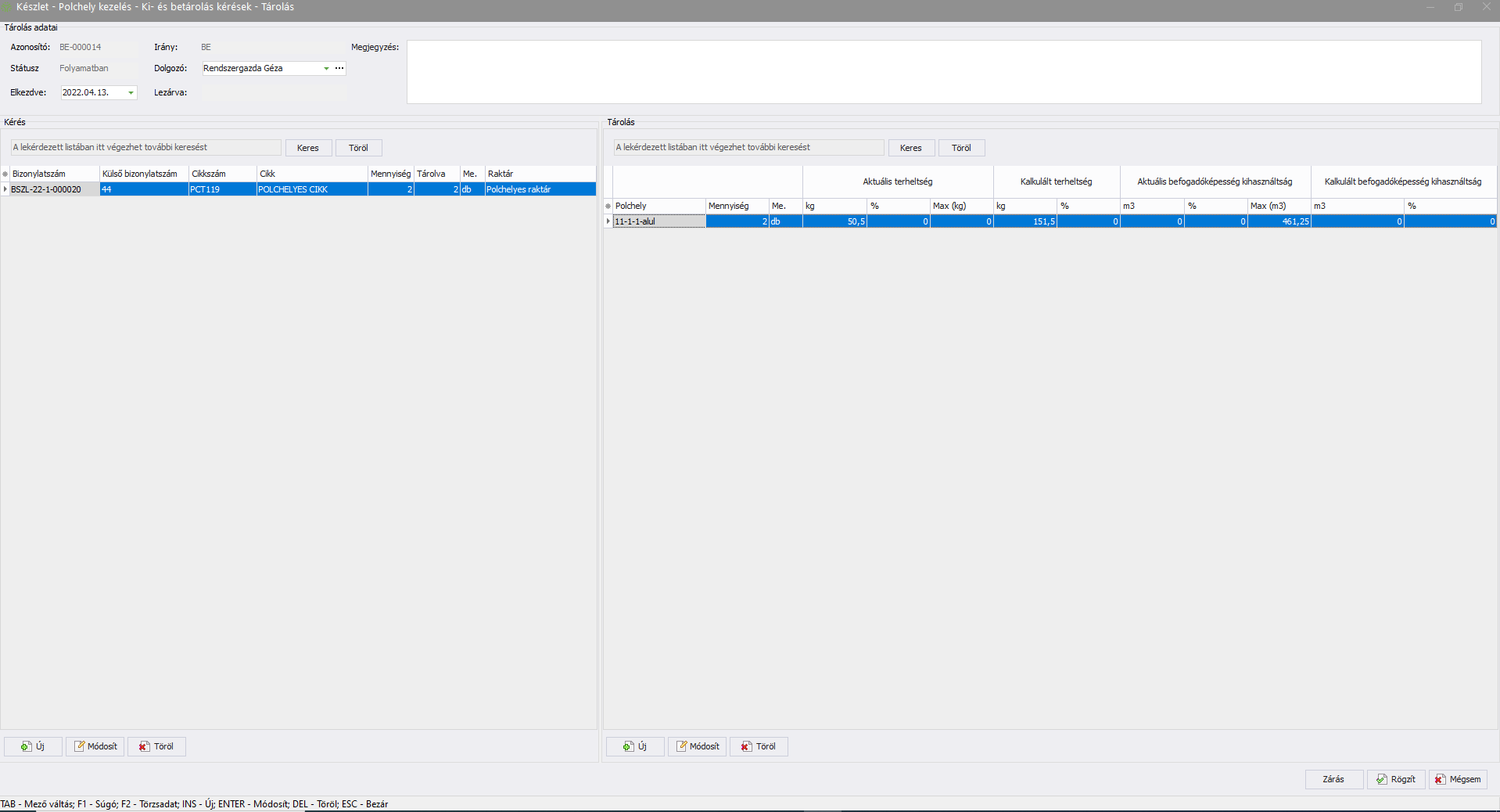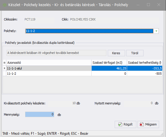 2. A megnyíló Készlet - Polchely kezelés - Ki- és betárolás kérések - Tárolás ablak bal oldalán található Kérés részben megjelenik a kiválasztott tárolási kérés, az ablak jobb oldalán található Tárolás részben pedig a polchely javaslat, melyet elfogadhat, illetve módosíthat:
