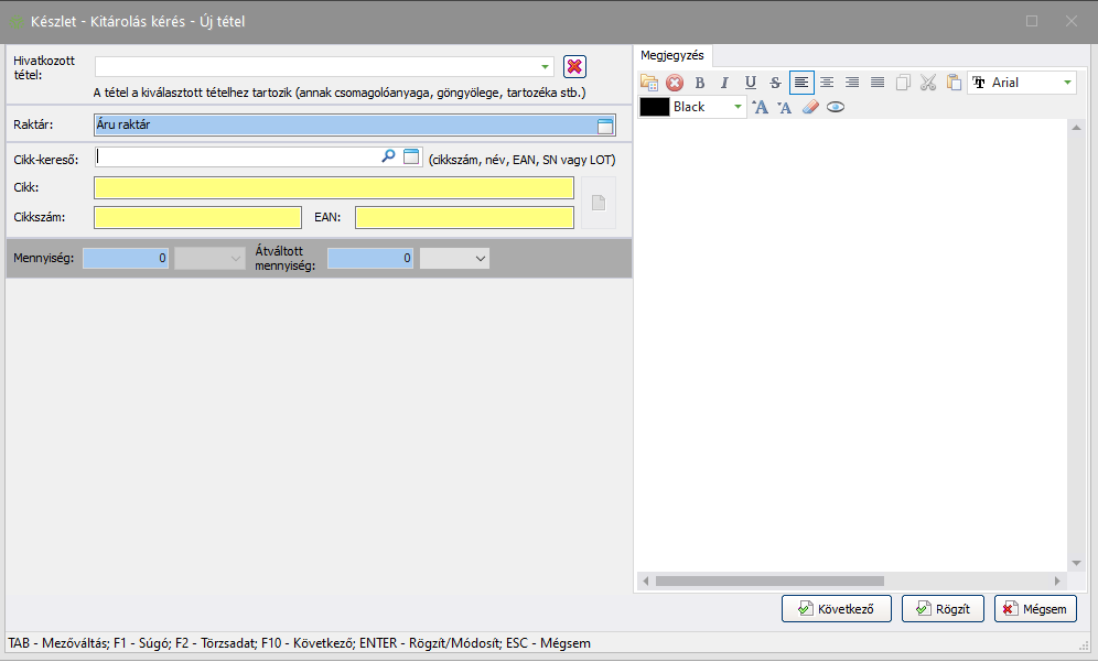 mezőbe a cikkhez tartozó megjegyzést. Ez a megjegyzés a nyomtatott bizonylaton közvetlenül az adott tétel alatt jelenik meg. - Ha szeretné rögzíteni a tételt, kattintson a