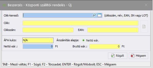 Ebben a fejezetben kizárólag a Központi szállítói rendelések karbantartásának egyediségeiről olvashat, a bizonylatok karbantartásának általánosságáról a Bizonylatok - Bizonylatok karbantartása c fejezetben olvashat.
