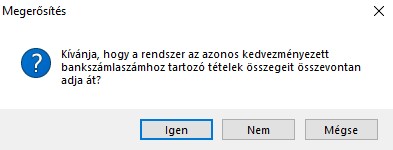 - Ha azt szeretné, hogy az egy számlaszámhoz tartozó tételeket a program összevonja egy tranzakcióba, akkor kattintson az Igen gombra. Ha fontos, hogy minden tétel külön tranzakcióként induljon, akkor kattintson a Nem gombra. Ha mégsem kívánja elküldeni a megbízási csomagot kattintson a Mégse gombra!