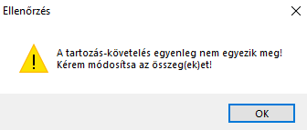 - azonos pénznemek esetén: a Tartozások/Követelések összegét a rendszer ellenőrzi, és amennyiben az egyenlegük nem egyezik meg, arról a rendszer figyelmeztetést küld,
