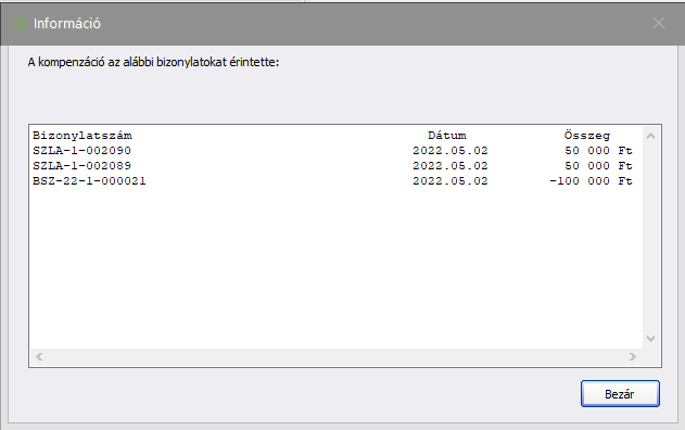 (Kompenzáció részletek) gombra kattintva érhető el egy Információs ablak, amelyben a Multi-kompenzációba bevont bizonylatok adatai érhetők el (Bizonylatszám, Dátum, Kompenzált összeg és annak Pénzneme kerül megjelenítésre).