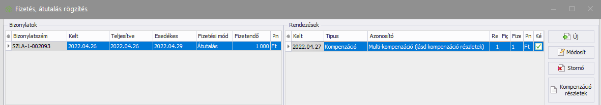 (Rögzít) gombot. A kompenzáció rögzítésre kerül, és a kompenzált bizonylatok esetében a Fizetés, átutalás rögzítés ablak Rendezések részében megjelennek a kompenzáció adatai, az Összesítés részben pedig láthatóvá válik a Rendezések összesen mezőben a kompenzáció összesen összege, valamint az aktuális Egyenleg összege.