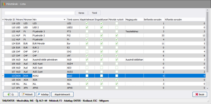 A Pénztárak listájában látható, mely pénztár engedélyezett, mely nyitott, és melyik pénztár van beállítva alapértelmezettnek, amennyiben az adott pénznemből több pénztár került létrehozásra.