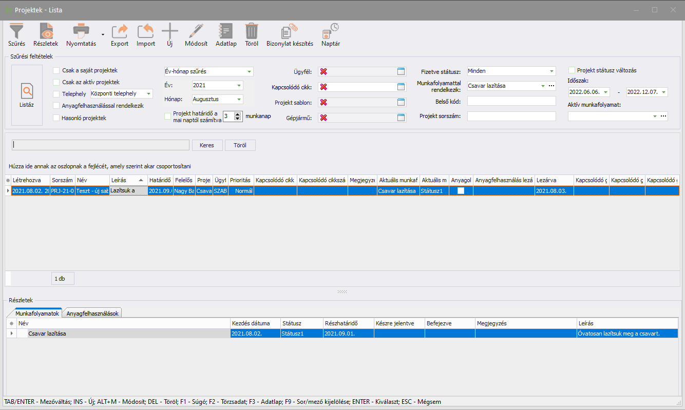 A lenyíló mezőben kiválasztott munkafolyamatra szűr. (Bármely projekt, melyben a kiválasztott munkafolyamat név szerint megtalálható.) |