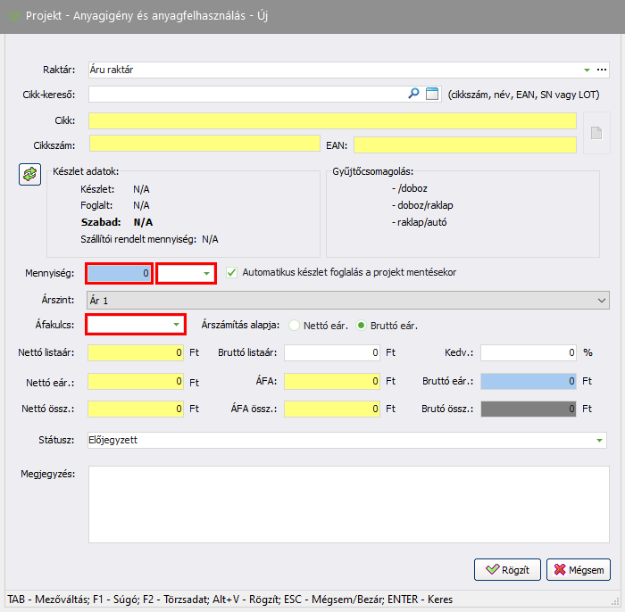 - ha egy cikket úgy rögzítenek, hogy a teljes mennyiséget befoglalják. FIGYELEM! Ez csak a projekt mentésekor lép életbe, projekt rögzítése előtt Előjegyzett státusz látszik!