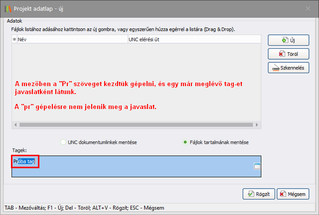 A Feljegyzések és megjegyzés fülön hozzáadhat szövegeket a projekthez. Az utolsónak hozzáadott feljegyzés megjelenik a Projektek listában. Törzsadatok - Paraméterek menüpontban beállítható, hogy a Megjegyzés mező megjelenjen-e a projekt adatlapon, vagy elegendő a feljegyzések opció használata.