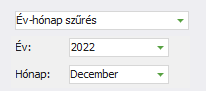 A felső mezőben beállíthatja, hogy mely időszakra történjen meg a szűrés: Év-hónap szűrés, Elmúlt időszak szűrés, Időszak szűrés, Nincs időszak szűrés. Év mező: itt választhat évet a szűréshez. Az időszak szűrés a projekt létrehozásának dátuma alapján szűr. |