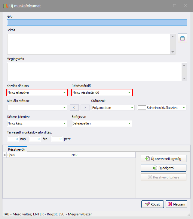 A Kezdés dátuma és a Határidő dátuma mezőkben beálltható az alapértelmezett óra:perc, mely értéket minden projekt indításkor bekészíti a rendszer. A beállítás elérhető a Paraméterek - Projektek - Általános beállítások lapon. A beállított óra:perc akkor fog megjelenni a Kezdés és Határidő mezőkben, ha aktiválta a paramétereknél a Projekt kezdés, határidő megadása óra, prec pontossággal beállítást. Bővebben: Paraméterek - Projektek c. részben.