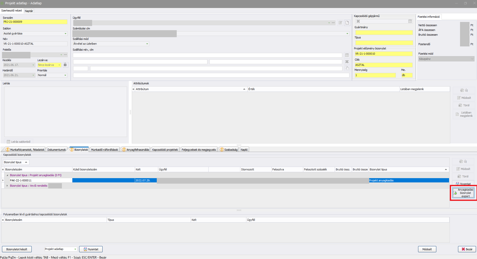 Amennyiben a karbantartó ablakból hozta létre a projektet, úgy a projekt adatlapon látszik az előzmény bizonylat száma, és a cikk - annak mennyisége - , melyhez kapcsolódóan a projektindítás történt.