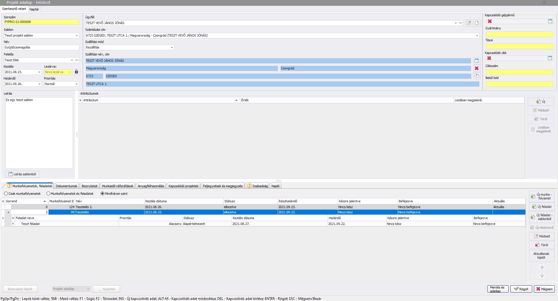 - A projekt Lezárva mezője szerkeszthető, amennyiben teljesülnek a zárás feltételei, melyet a sablonban adtak meg.