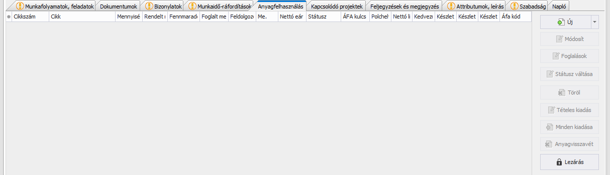 (Lezárás) gomb segítségével lezárható a projekt anyagfelhasználása, mely után a jogosultsággal nem rendelkező felhasználó csak az anyagfelhasználás tételeinek árát (árszint, áfa, egységár) tudja módosítani, valamint státuszváltás végezhető. Új anyagfelhasználást hozzáadni, törölni nem lehet. Lezárt anyagfelhasználással Adatlap módban van lehetőség foglalást és kiadást végezni a tételekre. Amennyiben a projektsablonban beállítottuk a projekt zárás feltételeként a Zárás csak lezárt anyag lista és kiadott anyag státusz esetén lehetséges opciót, úgy a projekt csak a Lezárás gomb használatával zárható. Az anyagfelhasználás felnyitása külön jogosultsággal lehetséges a