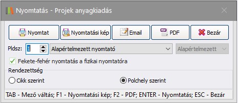 Ezzel a funkcióval a projekt adatlapját nyomtathatja ki. A nyomtatási ablakban egy jelölő segítségével kiválasztható, hogy nyomtasson-e munkafelvételi lapot a rendszer. Továbbá választható, hogy az adatlapon megjelenjenek-e a projekt anyagfelhasználás tételek árai.
