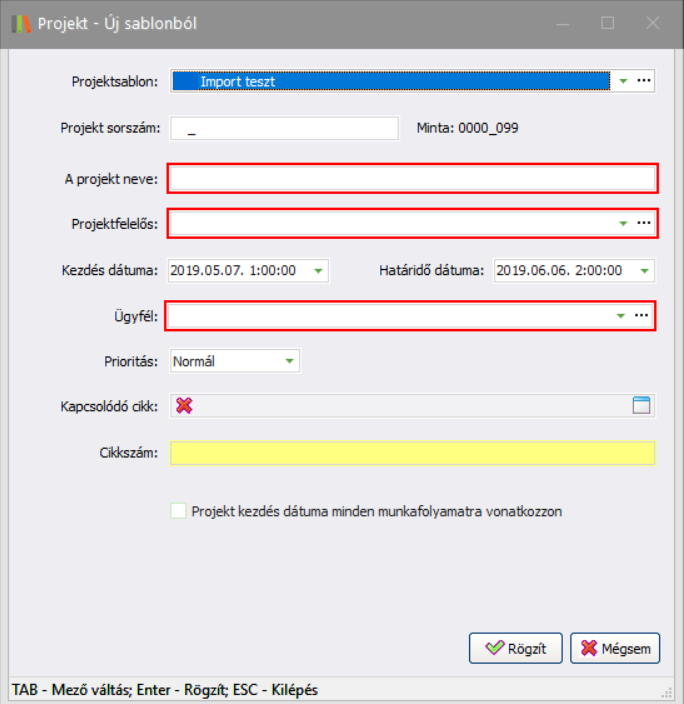 gombra. A kötelező mezők száma és típusa függ a projektsablon beállításaitól. A Projekt sorszám mező csak abban az esetben látszik, ha a sablon létrehozásakor bejelölte a manuális projekt sorszám megadására vonatkozó opciót.