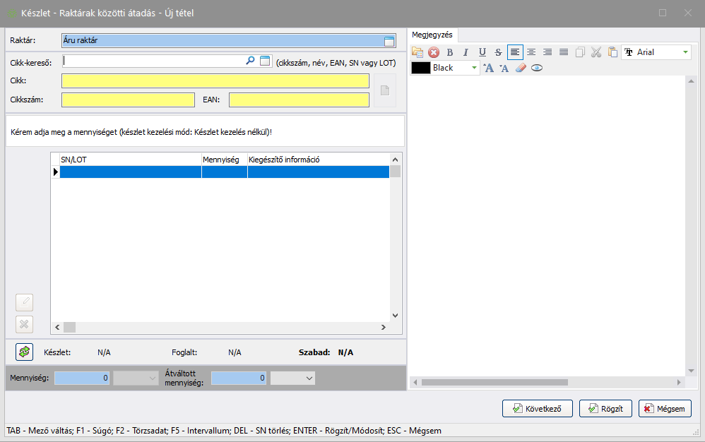 Fontos! Azon termékek, amelyek adatlapján a negatív készlet engedélyezett, nem rögzíthetők úgy, hogy nincs ténylegesen készleten a forrásraktárban!
