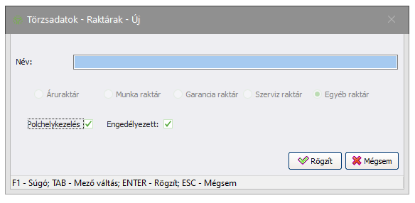 - Ekkor egy új ablakban megjelenik a rögzítendő raktár név mezője üresen, a kiválasztott
