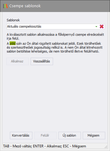 A Csempe sablonok ablakában található Visszaállítás gomb segítségével visszaállítható az aktuálisan betöltött sablon. Vagyis ha a listából kiválaszt egy sablont, azt "ideiglenesen" betölti a rendszer, amit a háttérben láthat, majd ha mégsem akarja használni a kiválasztott sablont, hanem meg kívánja hagyni az aktuálisan használtat, akkor a Visszaállítás gomb segítségével visszaállíthatja az aktuális sablont, ha nem emlékszik, mi a sablon neve, amit éppen használ.