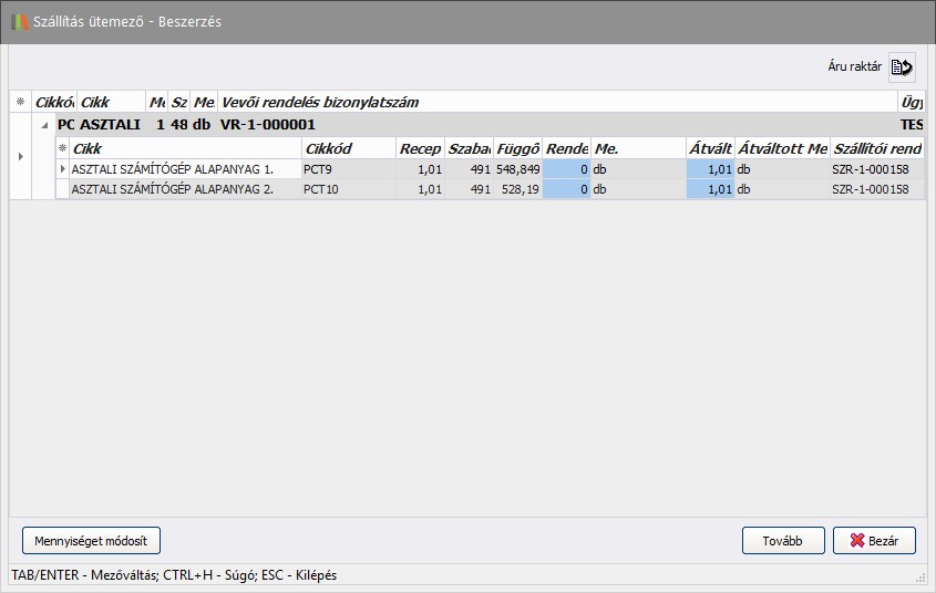 Itt lehetőség van a rendelendő mennyiség módosítására. Ehhez vagy duplán kattintunk a kijelölt soron, vagy használjuk a Mennyiséget módosít