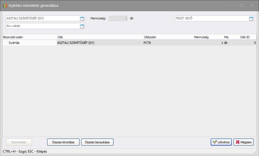 gomb után a Gyártási műveletek generálása ablakban a rendszer betölti a gyártani kívánt terméket, mennyiséget, ügyfelet, és raktárt, majd az Ellenőrzés