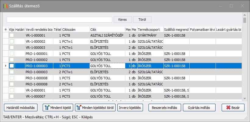 Ebben a menüpontban lehetőség van a vevői rendelés (+vevői rendelés foglalással és proforma) bizonylat tételeihez határidőt megadni, majd az ablakból beszerzés vagy gyártás indítható a kiválasztott tételekre.