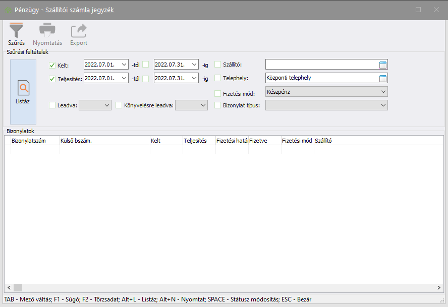 A fent beállított szűrési paraméterek alapján a bizonylatok listázása a |