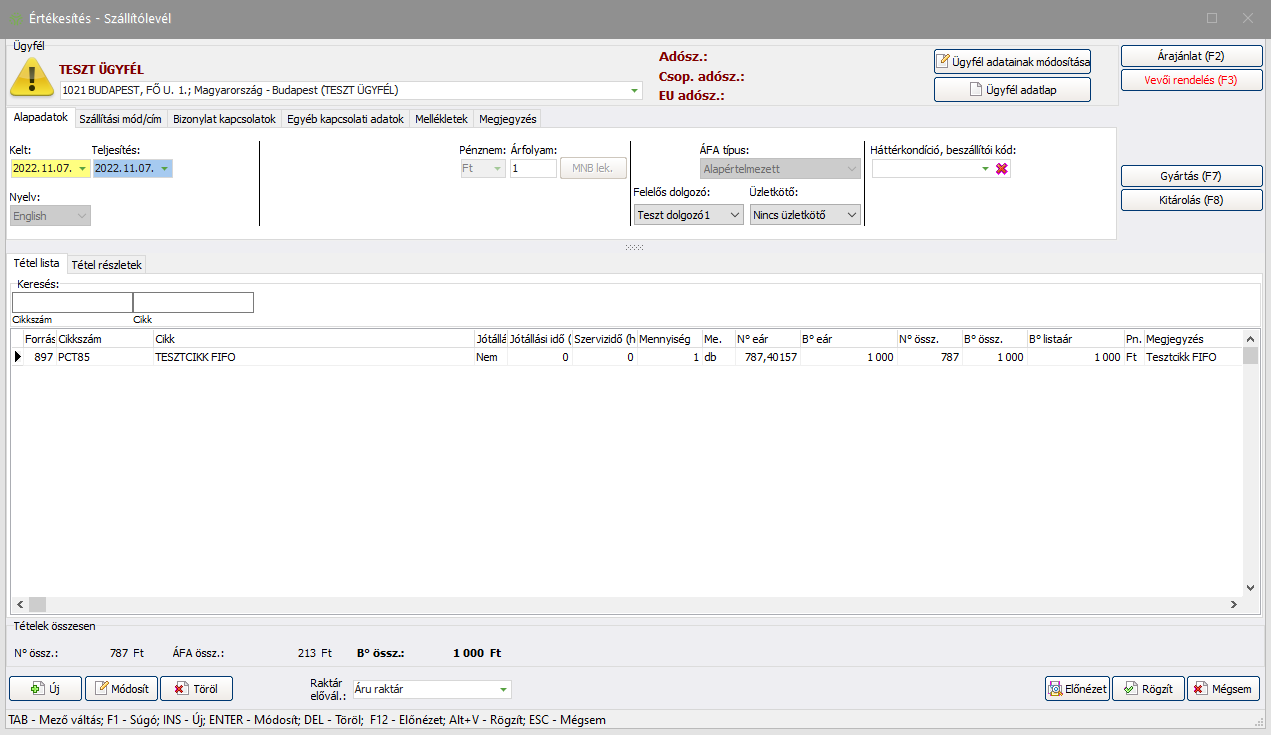 (Rögzít) gombra. A tétel adatlapja bezáródik, majd a bizonylat Tétel listájára felkerül az adott tétel. További tételek hozzáadásához ismételje meg a fenti műveletsort. A folyamatos tételrögzítésre a