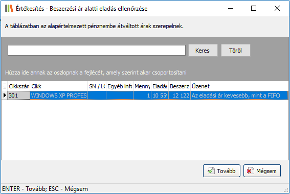 Értékesítéskor a beszerzési ár alatti eladás ellenőrzése kapcsoló, és a tételek között szerepel olyan, amelyet a beszerzési ár alatt kíván eladni, rögzítés előtt a rendszer az alábbi ablakban kilistázza ezen cikkeket: