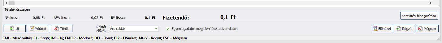 (Kerekítési hiba javítása) gomb, amely az Előleg tételek rendezésével 0 Ft-ra módosítja a szükséges összegeket. A megoldás a NAV által elfogadott megoldáson alapszik, miszerint mindig az Előleg tételt szükséges korrigálni és adatszolgáltatás során a +/- 1, valamint 2 Ft eltéréseket befogadja és feldolgozza DONE státusszal. Abban az esetben, ha ezen intervallumon kívül esik az összeg, akkor a gomb automatikusan inaktív.