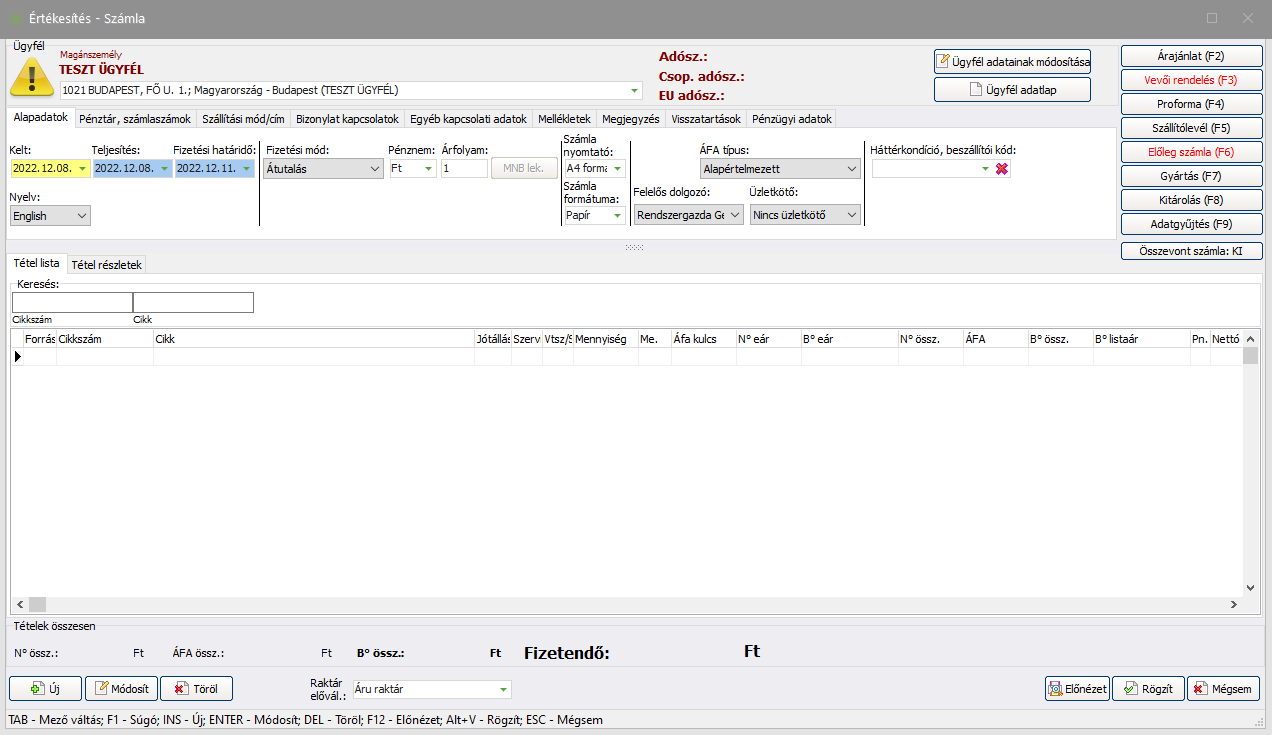 - Ha az Értékesítés - Karbantartás - Proforma karbantartása - Új menüpont segítségével indít új számla készítést, akkor a proformán lévő tételeket és adatokat átveszi a rendszer, új tétel hozzáadása nem lehetséges a számlához.