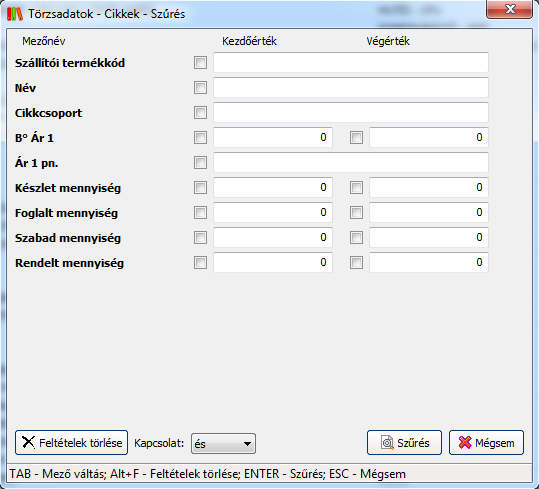A beállítható szűrő feltételek között mindig azok a mezők jelennek meg, amely oszlopok a listában aktuálisan láthatók. Ha olyan mezőre szeretne szűrni, amely oszlop jelenleg nem látható a listában, úgy először be kell állítani annak megjelenítését (lásd Törzsadatokról általában – Megjelenített mezők fejezetben). A szöveges mezők szórészlet megadásával, míg a szám és dátum típusú mezők Kezdőérték-Végérték páros megadásával szűrhetők. Lehetséges csak Kezdőérték vagy csak Végérték megadása is a jelölőnégyzetek beállításával.