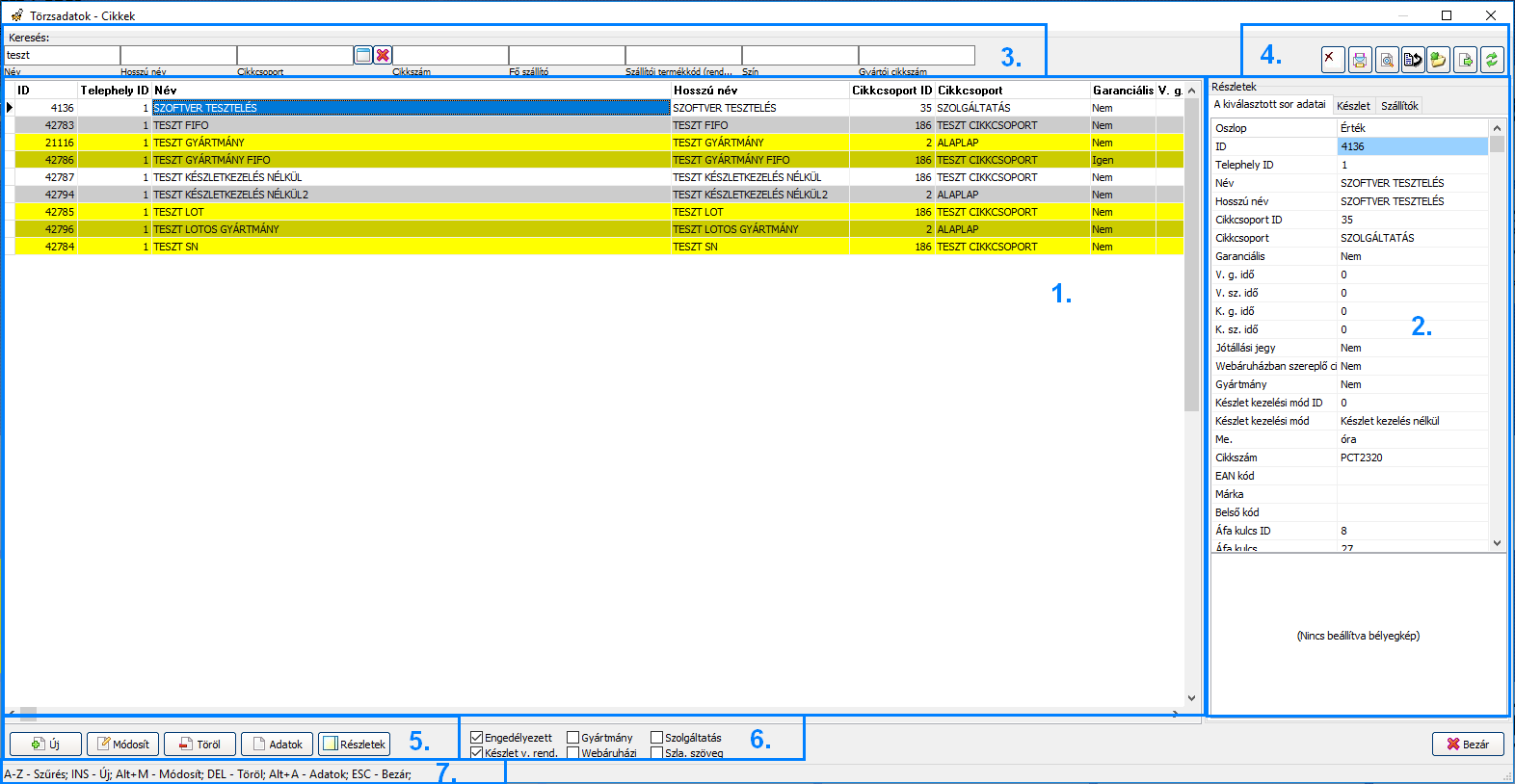 - 7: A gyorsbillentyűk. Minden törzsadat ablak rendelkezik gyorsbillentyűkkel is, melyek segítségével a leggyakrabban használt funkciók (például új elem hozzáadása, ablak bezárása) egy-egy gombbal vagy gombkombinációval is elérhető.