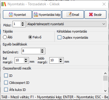 Összesítendő mezők: a rendszer képes a számadatot tartalmazó oszlopok összesítésére a nyomtatott listán. Itt választható ki, mely oszlopok (mezők) adatait összesítse, a kiválasztott összesítések a nyomtatott lista végén jelennek meg.